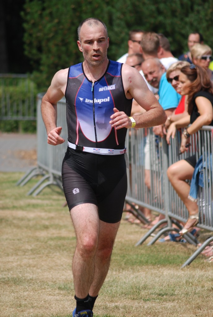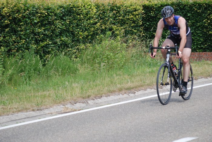 Eénmaal op de fiets vind ik pedalerend mijn ritme en ademhaling terug. Zoek een tempo waarvan ik weet dat ik het volhoud en slaag erin een aantal minder trage zwemmers in te halen. Ik zit helaas niet in een snel peloton en ben vooral op mezelf aangewezen. Herken mensen langs het parcours dat zo goed als aan mijn ouderlijk huis passeert en geniet terwijl ik voldoende drink en nog wat suikers naar binnen speel. Toch fijn om dit in eigen dorp te doen. Na twee rondjes duik ik de tweede wisselzone in om een laatste keer van schoeisel te veranderen. De vrouw en dochter van een fietsmakker moedigen me aan. Ik antwoord “rustig aan”, want heb mijn knop al omgedraaid om gecontroleerd de meet te halen. Een official stopt me even en wijst me er nog op dat ik te snel mijn helm losgemaakt heb. Ik geef hem een schouderklopje en bedank hem met de woorden dat ik maar een liefhebber ben. Hij lacht en wenst me succes want zal net als mij ook gemerkt hebben dat de koplopers hun eindspurt al achter de rug hebben.
