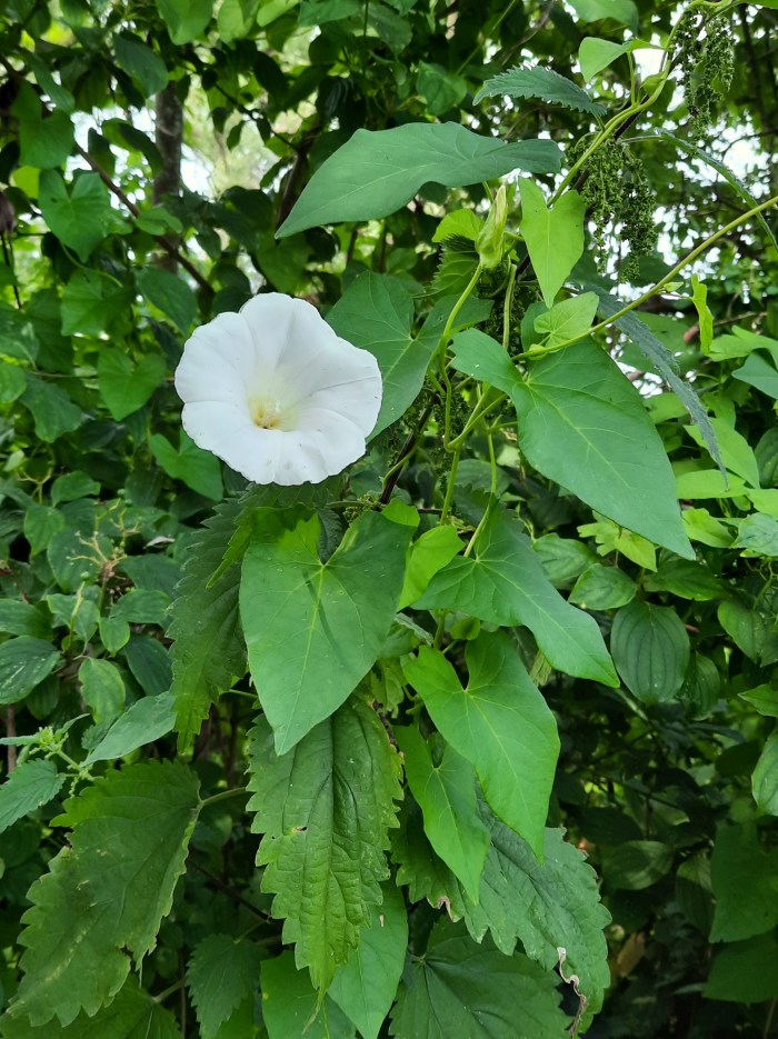 Klimplantje met hartvormige blaadjes omarmt brandnetel en bloeit. Groeien ondanks prikjes onderweg…