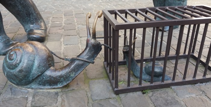 (Foto: stuk van ‘Djoseph èt Françwès‘, sculptuur van Suzanne Godart – Place d’Armes in Namen)
