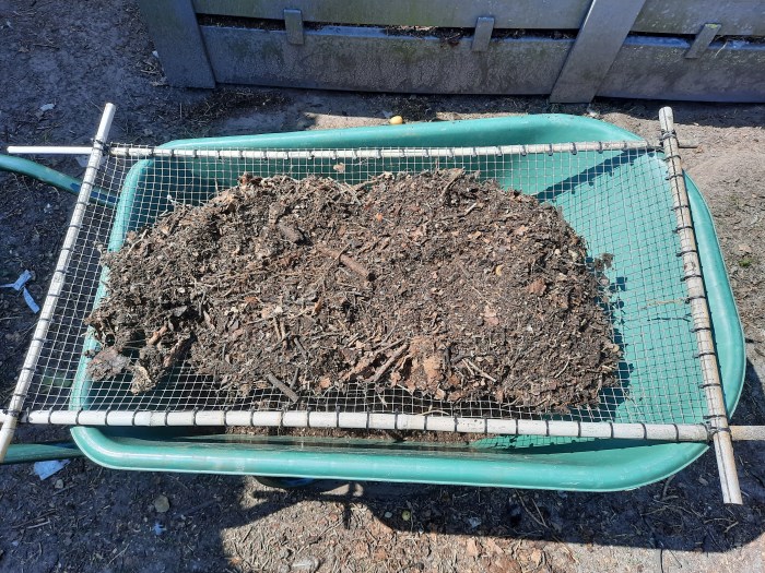 Wat oude bamboestokken, een restje kippengaas en colsonbandjes – of kabelbinders zoals ze blijkbaar ook genoemd worden. Meer is niet nodig om een meer dan behoorlijke zeef te maken om de nog wat te dikke takken netjes te scheiden van de vruchtbare compost die wat mij betreft al klaar is voor gebruik en de bodem rond bloemen en planten van verse energie te voorzien. Composteren stimuleert de eindeloze cirkel waarmee de natuur er telkens weer in slaagt zichzelf nieuw leven in te blazen. En verkleint onze ecologische voetafdruk omdat er minder afgevoerd en elders verwerkt moet worden.