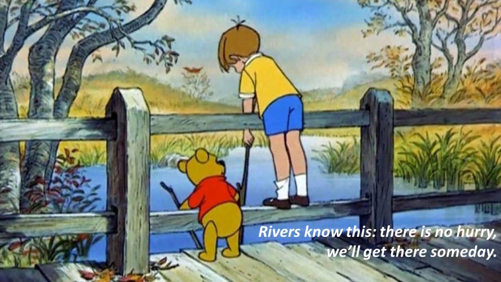 Plots zag ik mezelf staan als dat jongetje bij Winnie de Poeh, naast elkaar op een bruggetje terwijl een riviertje traag onder hen door stroomt. Want het is dat beeld dat ik tijdens deelshops gebruik. Niet enkel om te verklappen dat mijn meisjesnaam Winnie geweest zou zijn en de gedachte op te gooien of er dan misschien wat minder een twijfelende Tommy (Thomas) in mij gescholen zou hebben. Ook en vooral voor de wijze woorden van het zachte beertje hoe de rivier weet dat het geen zin heeft om zich te haasten en er hoe dan ook wel geraakt.