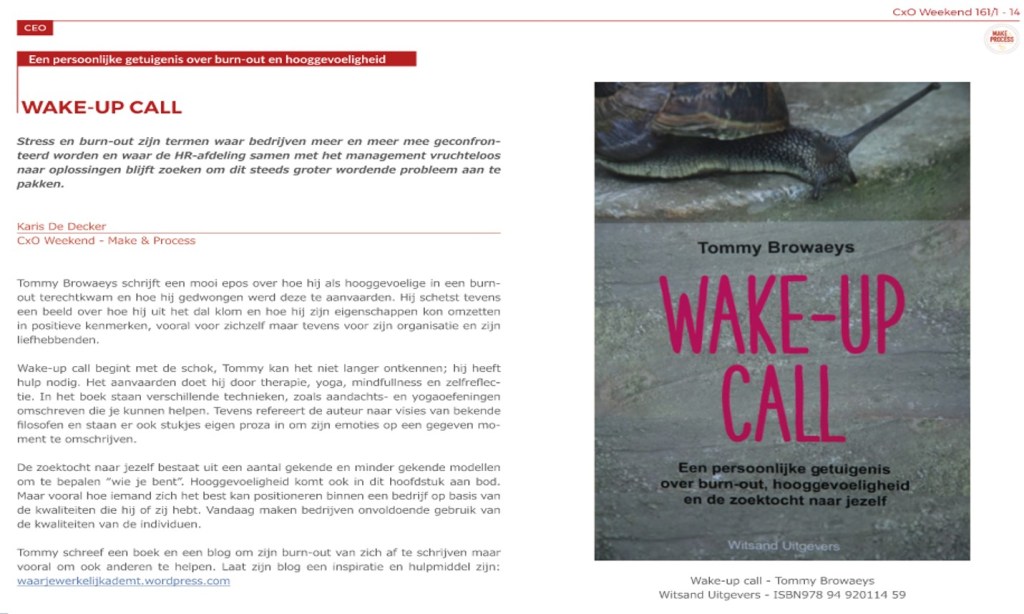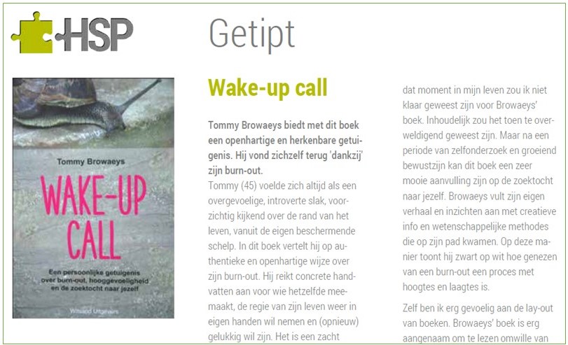 De recensente van HSP Vlaanderen noemt Wake-up Call in het magazine De Cocon (#77) een mooie inspiratie voor je eigen zoektocht naar een gelukkiger leven:
