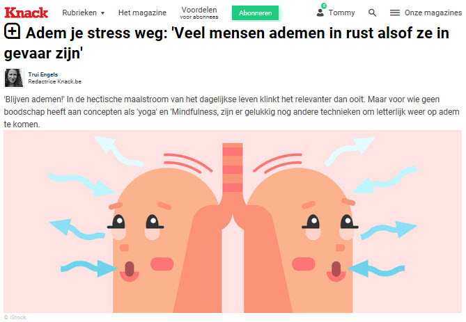 Knack publiceerde een artikel rond het wetenschappelijke belang van een goede ademhaling bij stress en burn-out, met een verwijzing naar mijn ervaringen: