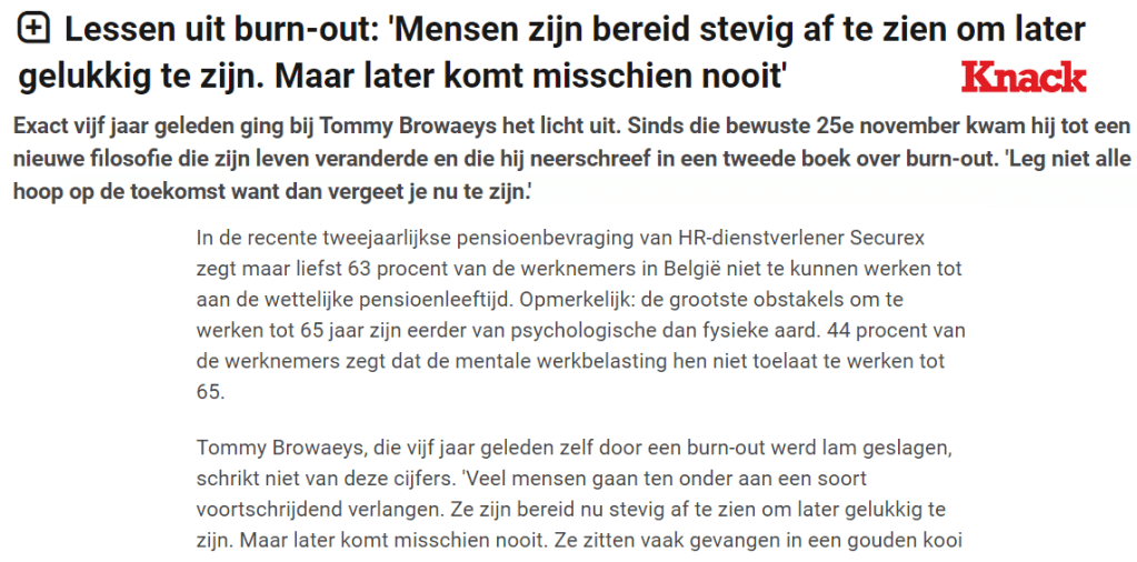 Knack publiceert mijn opiniestuk als reactie op de uitspraak van Roland Duchâtelet dat de meeste burn-outs fake zijn en ook mijn tips voor in de file; ondertussen verschijnt er regelmatig een artikeltje van me (overzicht):