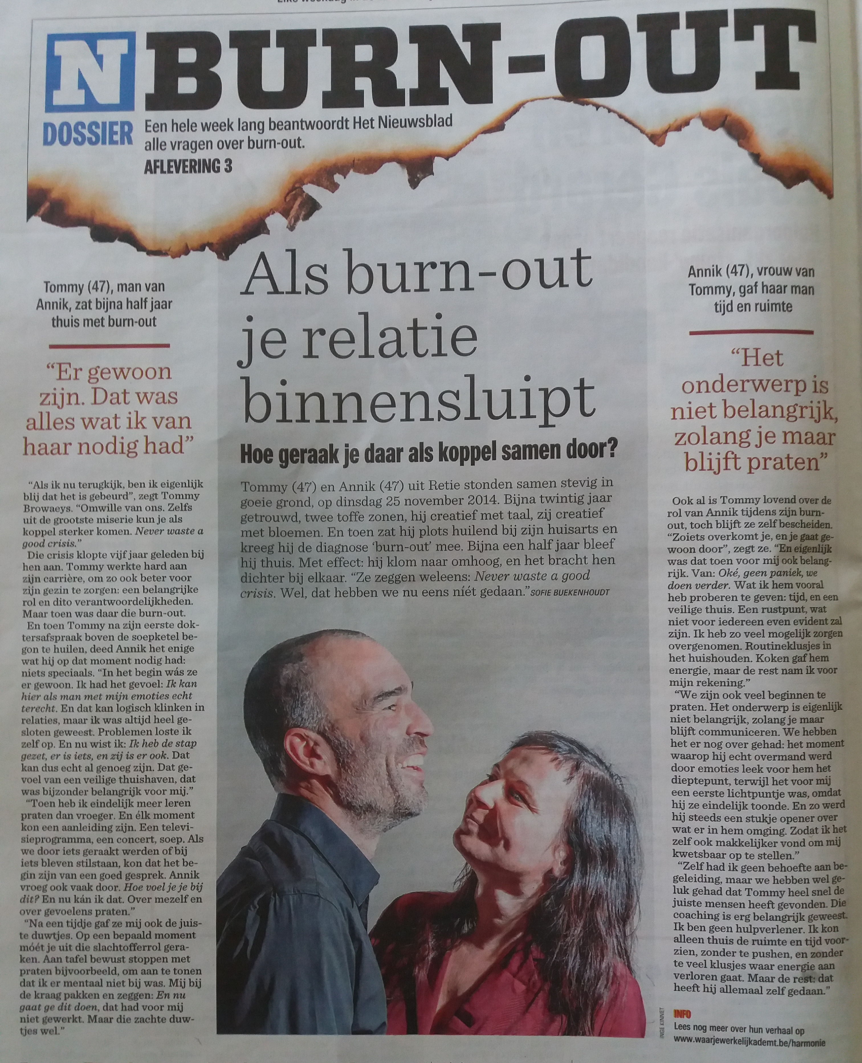 Blij dat het Nieuwsblad bij ons aanklopte om burn-out als koppel mee bespreekbaar te maken. Want in het lachkuiltje van je dierbaarste is je kwetsbare traan veilig. De online versie lees je hier.